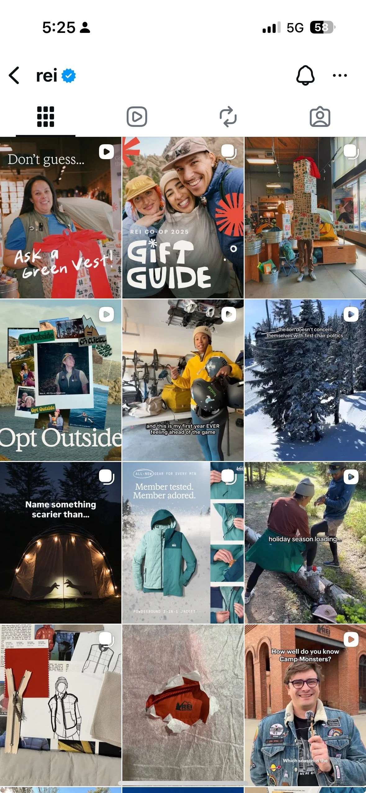 Strategy + Solution: We revamped all content pillars, channel tactics, and verbal/visual expression to lean into the friendly, approachable expertise — with a dose of whimsy — that is synonyous with green vests, but adapted for channel best practices. This means less polish and more pull into the sometimes unspoken truths around our core/adjacent activities and outdoor culture that makes REI the go to source and escape for the outdoors.